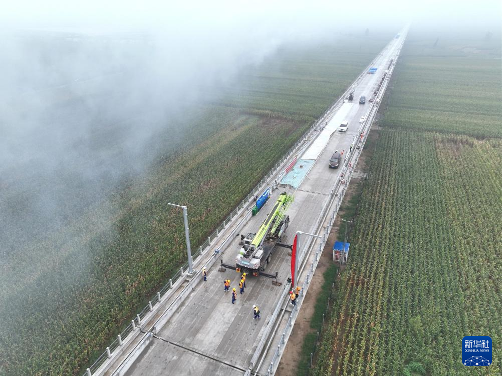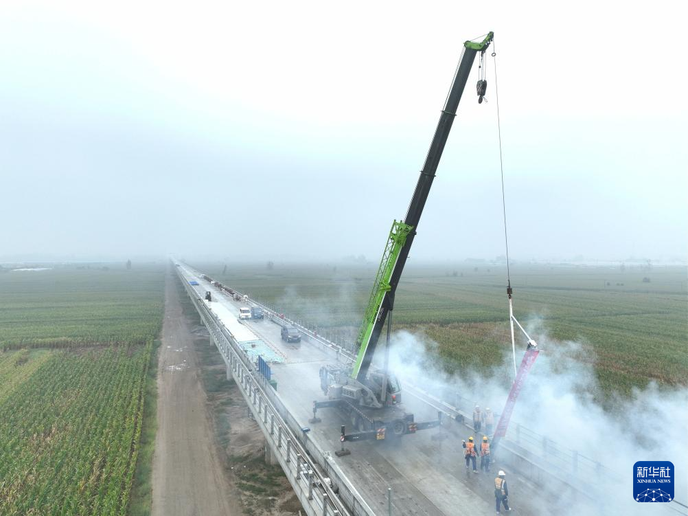 9月13日,中铁电气化局的工人在雄商高铁山东菏泽段吊装接触网支柱(无人机照片)。新华社记者邢广利 摄