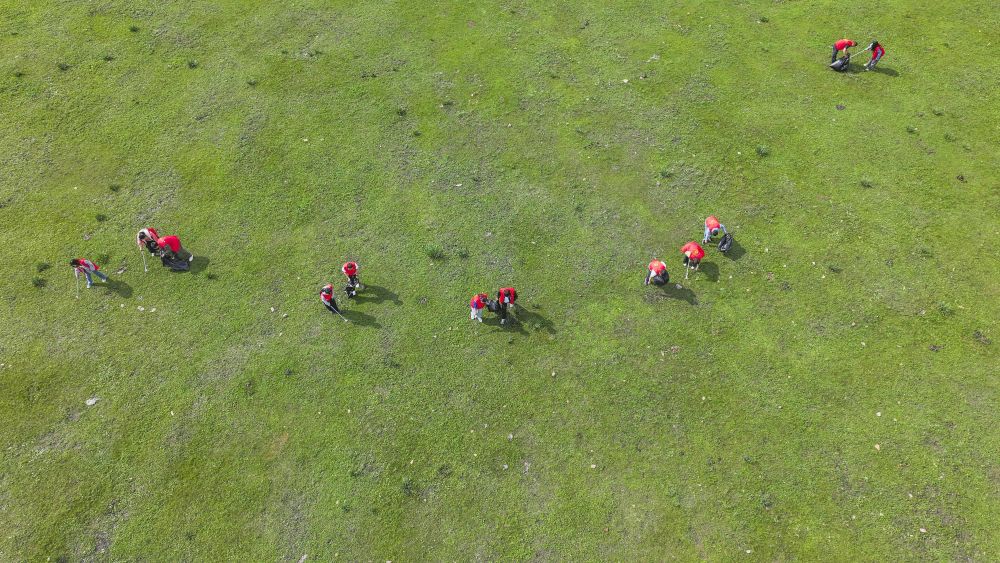 承德市志愿者在坝上草原捡拾杂物(无人机照片)。新华社发(刘满仓摄)