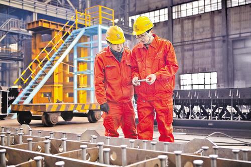 近日,中铁山桥集团有限公司焊工特级技师张明(右)和工友正在对钢构件进行分析,为焊接做准备。河北日报通讯员 董海岩 摄