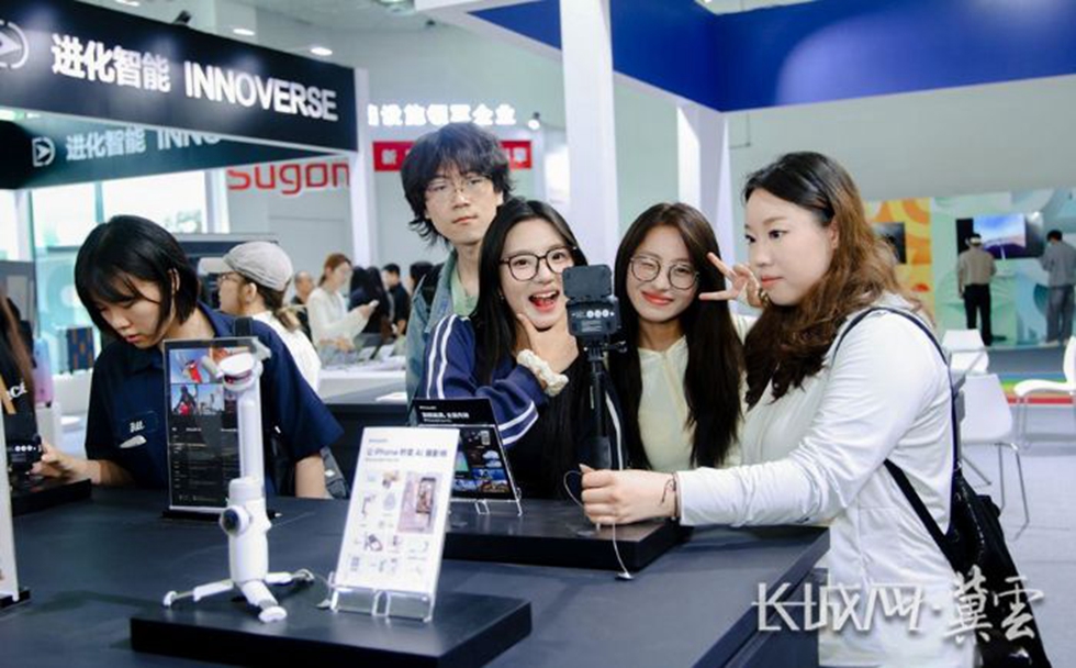 观众在展览会上参观、体验有AI拍照功能的摄像展品。长城网·冀云客户端记者李征 摄