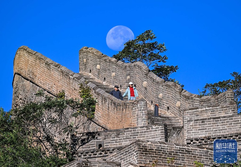9月21日清晨,游客游览金山岭长城,月亮仍高高挂在长城上空。图自新华社