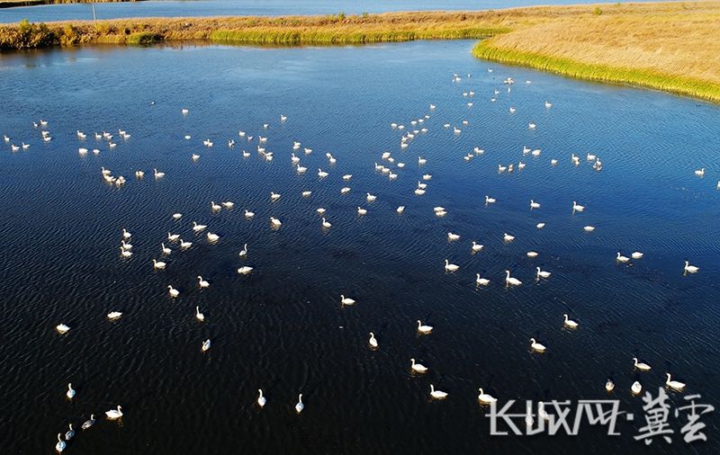 天鹅在怀来县官厅水库国家湿地公园栖息。孙慧军 摄
