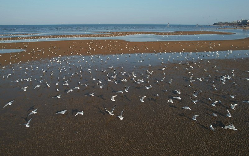 3月31日,一群水鸟在秦皇岛市北戴河区沿海湿地飞舞(无人机照片)。(资料片)新华社发
