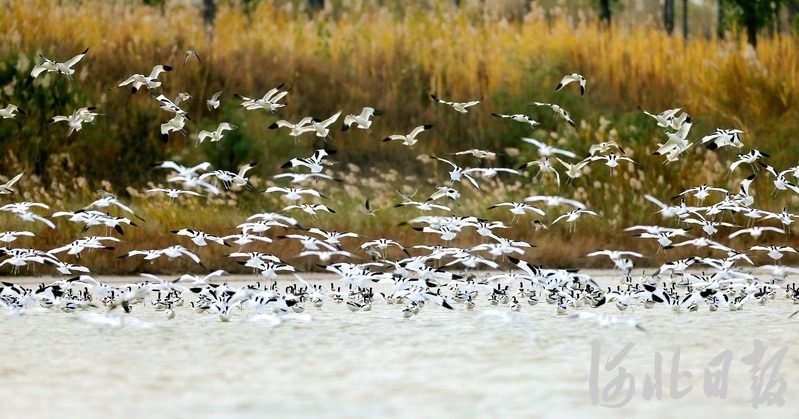 鸟群在南大港湿地和鸟类自然保护区水面上盘旋嬉戏。(河北日报资料片)