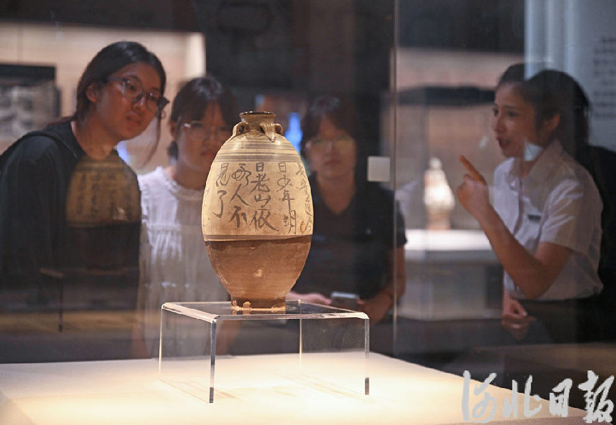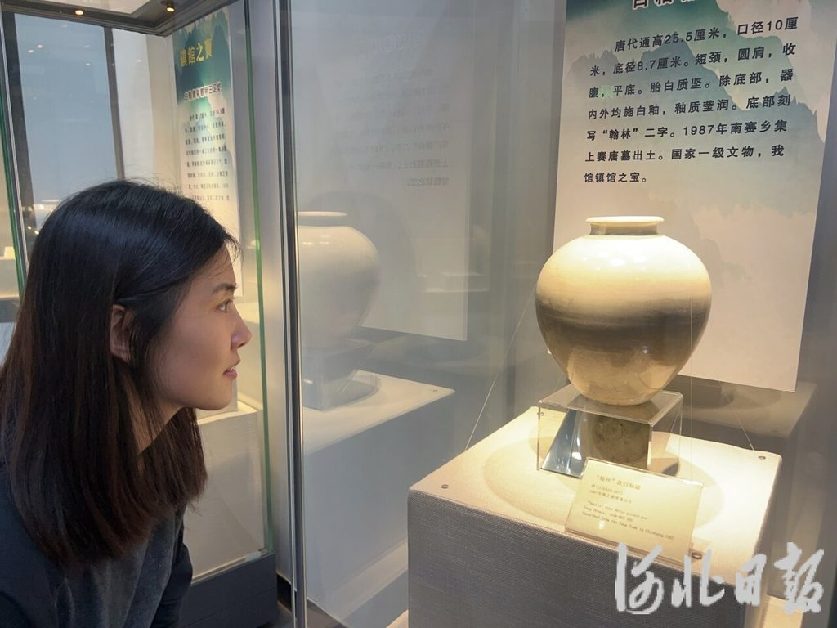 9月14日,一名游客在内丘县的邢窑博物馆参观邢瓷展品“翰林罐”。柳梦珂 摄