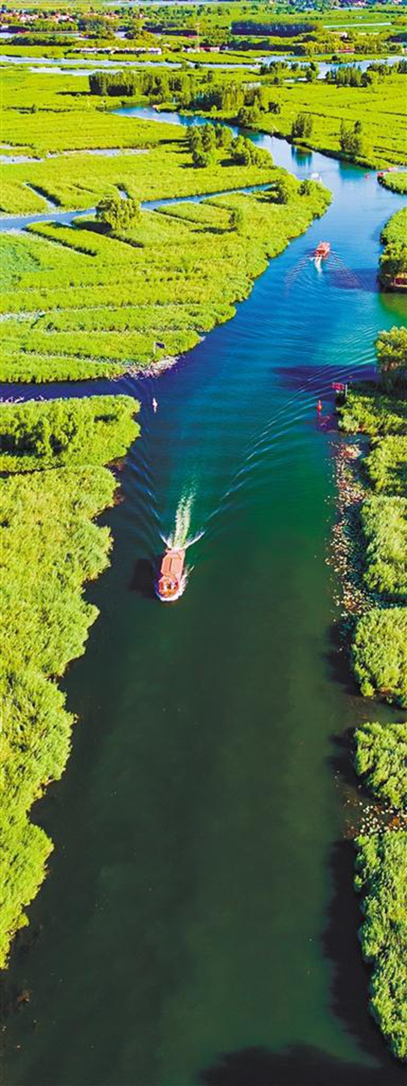 9月5日,“华北明珠”白洋淀碧波荡漾。雄安新区通过实施大规模系统性生态治理,白洋淀生物多样性大幅提升,水质稳定保持在Ⅲ类,跻身全国良好湖泊行列。