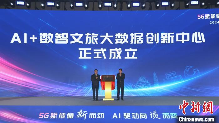 10月17日,2024“5G+智慧旅游”创新发展交流活动在河北雄安举办。活动以“5G赋能循‘新’而动,AI驱动向‘质’而变”为主题,700余位来自全国各地的文化和旅游、信息通信等产学研领域代表进行了交流。图为Al+数智文旅大数据创新中心揭牌仪式。中新社记者 韩冰 摄