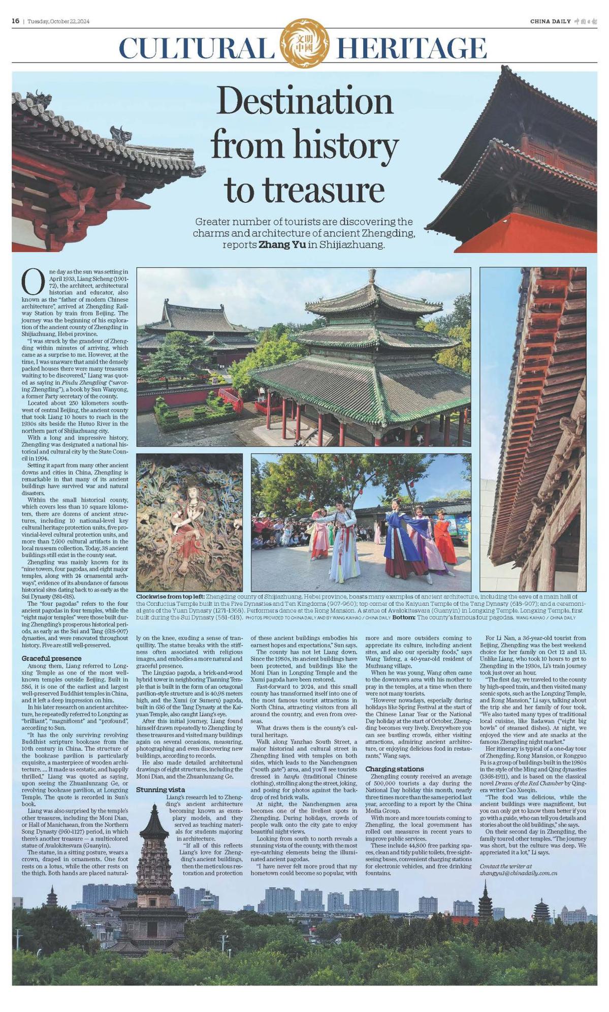 2024年10月22日,《中国日报》第16版刊发整版报道Destination from history to treasure(到正定探寻历史文化珍宝),讲述了国家历史文化名城正定丰厚的历史文化底蕴,以及近年来当地古城保护、文旅发展的盛况。