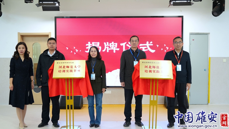 “河北师范大学培训实践基地”揭牌仪式现场。雄安容和海棠幼儿园供图