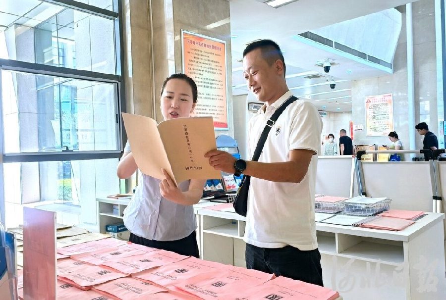 7月19日上午,廊坊市安次区行政审批局工作人员杨晴(左)为马超讲解“信用修复高效办成一件事”相关流程。河北日报记者刘英 摄