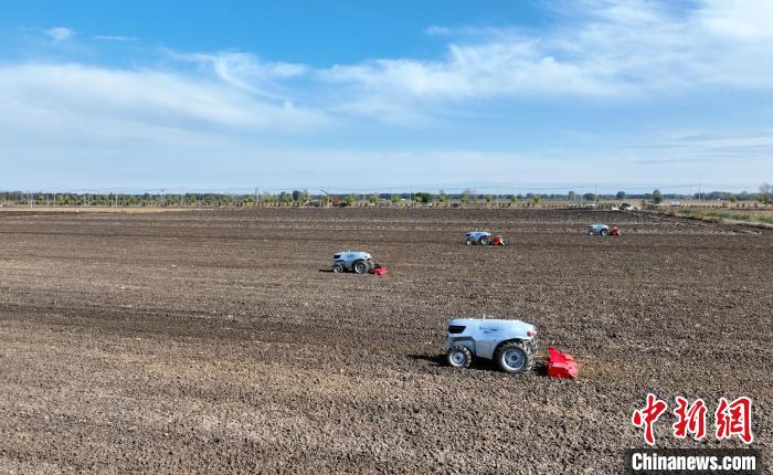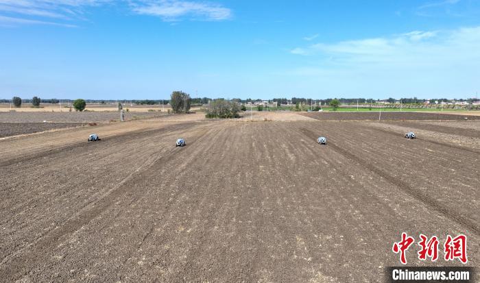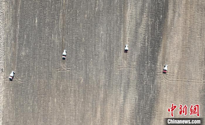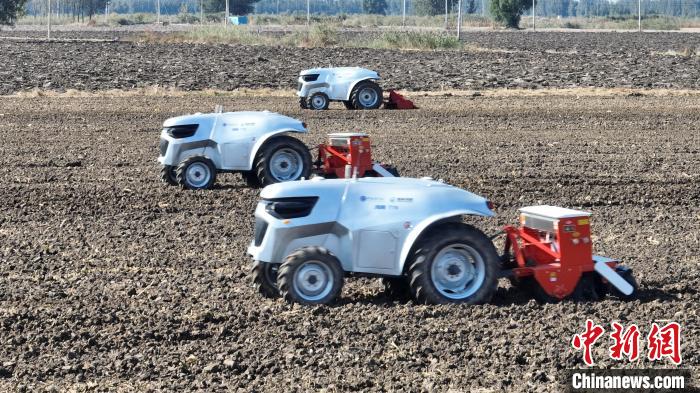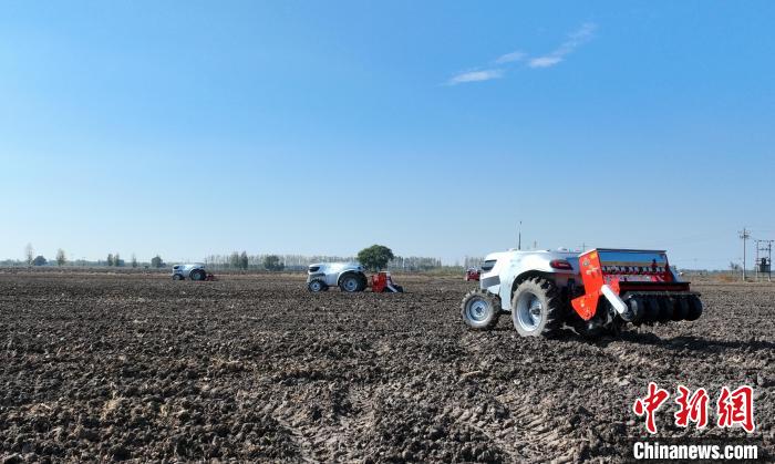 10月22日,河北雄安新区安新县端村镇关城二村一农田内,几台“鸿鹄T70”电动智能拖拉机正在进行秋播作业。据了解,今年雄安新区公共服务局通过实施“雄安新区农业全产业链数字化转型示范应用场景项目”,重点打造“数字决策+无人农机”的无人农场示范场景,依托国家数字农业区域(京津冀)创新分中心与中国科学院雄安创新研究院(筹)第三代新能源智能农机技术,在雄安新区实施5000亩农田“耕、种、管、收”全链条环节无人化示范作业。(无人机照片)中新社记者 韩冰 摄