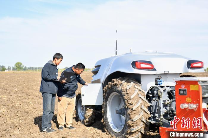 10月22日,河北雄安新区安新县端村镇关城二村一农田内,工作人员对“鸿鹄T70”电动智能拖拉机进行秋播作业前检测。中新社记者 韩冰 摄