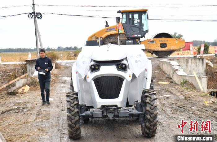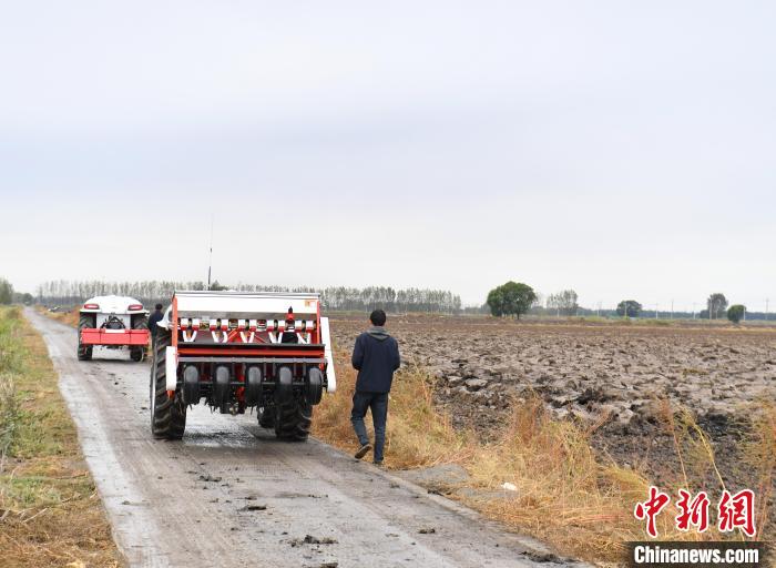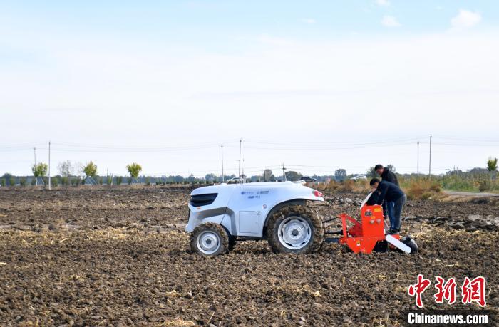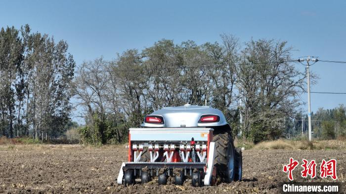 10月22日,河北雄安新区安新县端村镇关城二村一农田内,“鸿鹄T70”电动智能拖拉机准备进行秋播作业。中新社记者 韩冰 摄