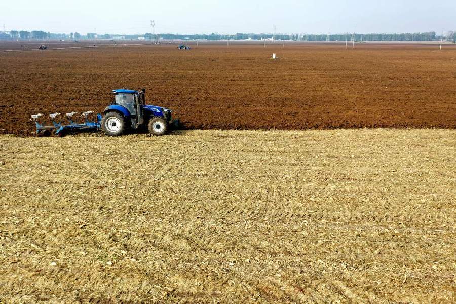 10月21日,在邢台市南和区阎里乡阎里村,农民驾驶农机翻耕土地(无人机照片)。新华社记者王晓 摄