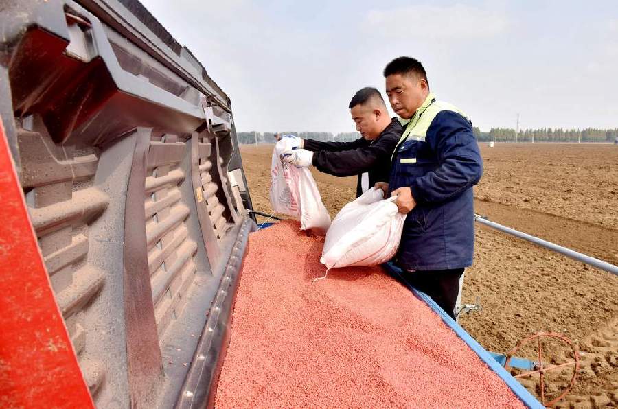 10月21日,在河北省邢台市南和区阎里乡阎里村,农民向播种机添加小麦种子。新华社记者王晓 摄