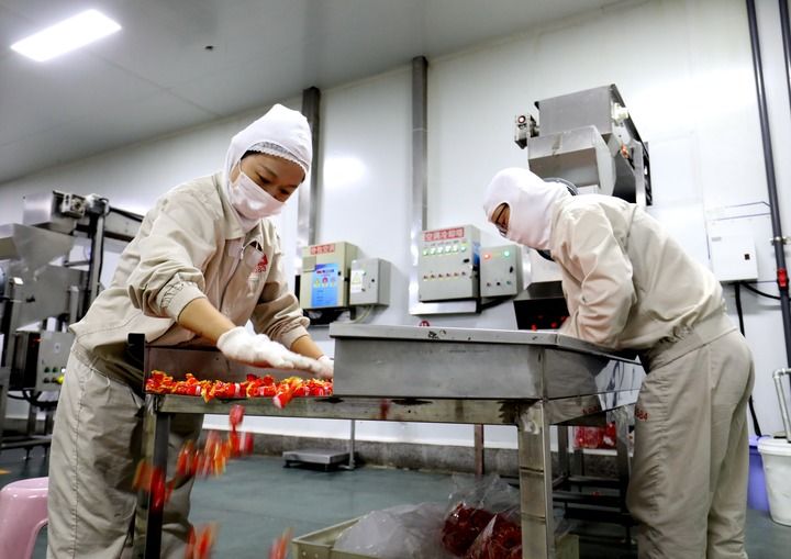 在与味盟公司相邻的河北哆呋食品有限公司,一辆辆运输车往来穿梭,工人们正在将刚生产出来的产品搬上货车,准备发往全国各地。“中秋节和国庆节前,企业接到一批大订单,工人们加班加点,机器开足马力。”哆呋食品公司负责人赵军利说,他们生产的豆干和青豌豆销售不错,尤其在高铁上备受旅客喜爱。