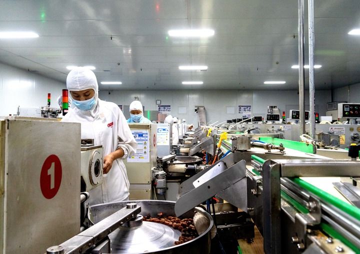 9月28日,在河北邱县经济开发区一家食品加工企业,工人对生产出来的糖果进行二次筛选。新华社发(孙海峰 摄)