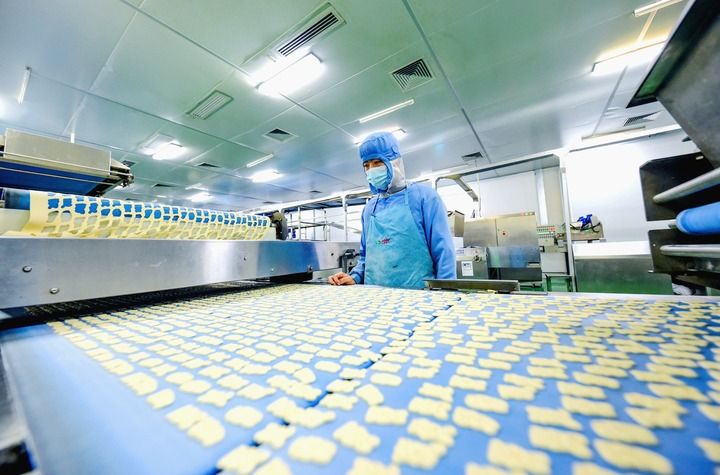 揉面、发酵、成型、烘烤、喷油……在河北味盟生物科技食品有限公司生产车间,不到40分钟,就有一批弥漫着诱人香气的苏打饼干从自动化生产设备上包装下线。
