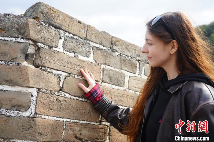10月16日,乌克兰留学生娜斯佳观看金山岭长城上的“文字砖”。梁志青 摄