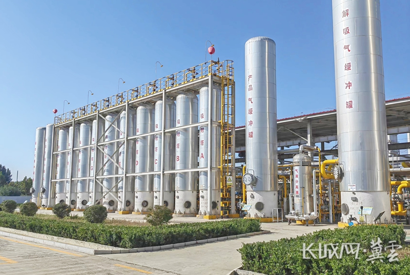 在制氢项目现场,记者看到顺放气缓冲罐、变压吸附塔、产品气缓冲罐等高纯氢制备装置高耸林立,工作人员正在对制氢装置进行安全巡检。旭阳集团定州园区年产氢气达5200万标方,氢的纯度在99.999%以上,构建起了整个氢能产业链的源头保障和连续稳定供给能力。