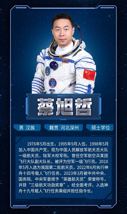 执行神舟十九号载人飞行任务的航天员乘组由蔡旭哲、宋令东、王浩泽3名航天员组成,蔡旭哲担任指令长。在蔡旭哲的家乡河北深州,父母和亲朋好友心情激动,期待共同见证蔡旭哲重返太空的出征时刻。