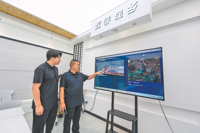 李庄子村党支部书记曹建民(右)和雄安国创中心相关负责人,一起查看“数字淀乡”平台信息。李畅 摄