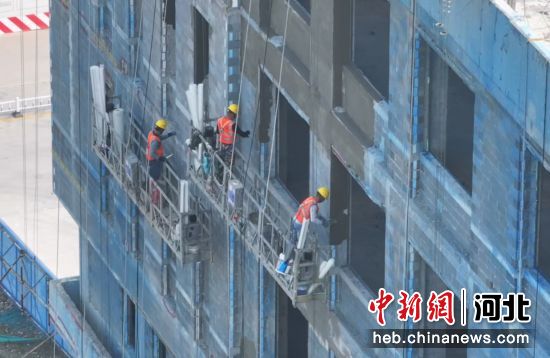 图为施工人员正在进行楼体外立面作业。 张伟 摄