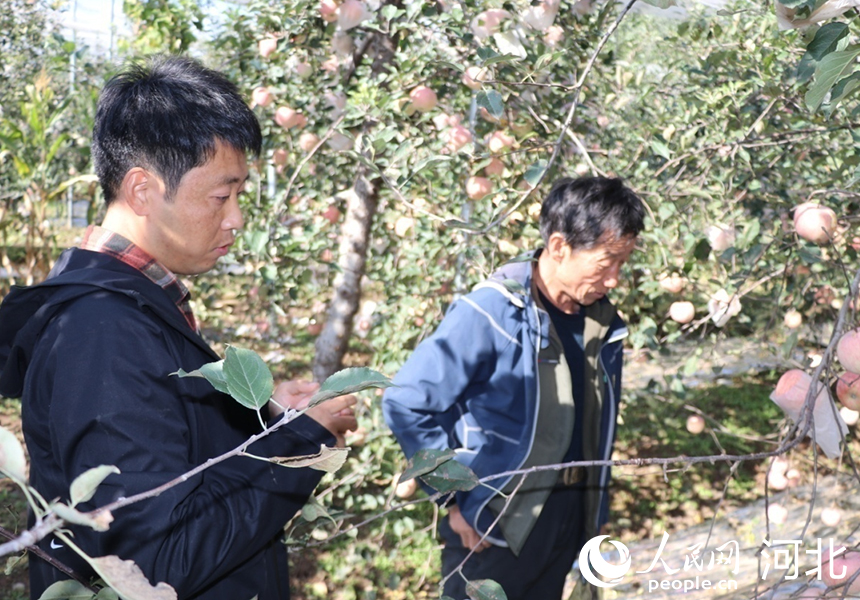 李保国山区开发与林果产业创新团队队员、河北农业大学青年教师王迎(左)和杨双奎在交流苹果种植新技术。人民网记者祝龙超 摄