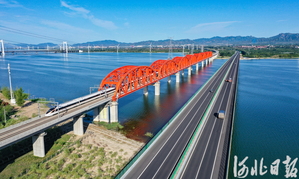 2022年7月14日,列车通过京张高铁官厅水库特大桥。 河北日报记者耿辉 摄