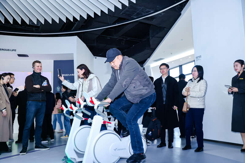 11月4日,河北“雄安印象”展馆,上合组织国家青年领袖通过脚踏自行车体验城市漫游项目。主办方供图