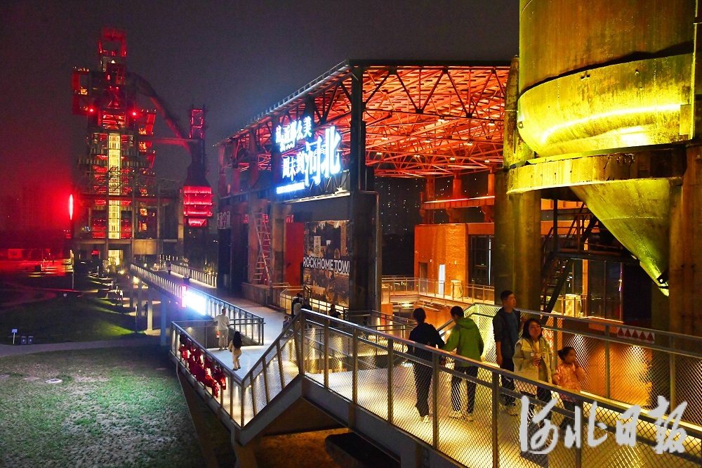 11月2日晚7时,石家庄工业遗址公园灯光亮起。变幻的灯光将两座高炉映照得酷炫十足,闪亮的“Rock Home Town”(“摇滚之城”)标志带给人们强烈的视觉冲击。