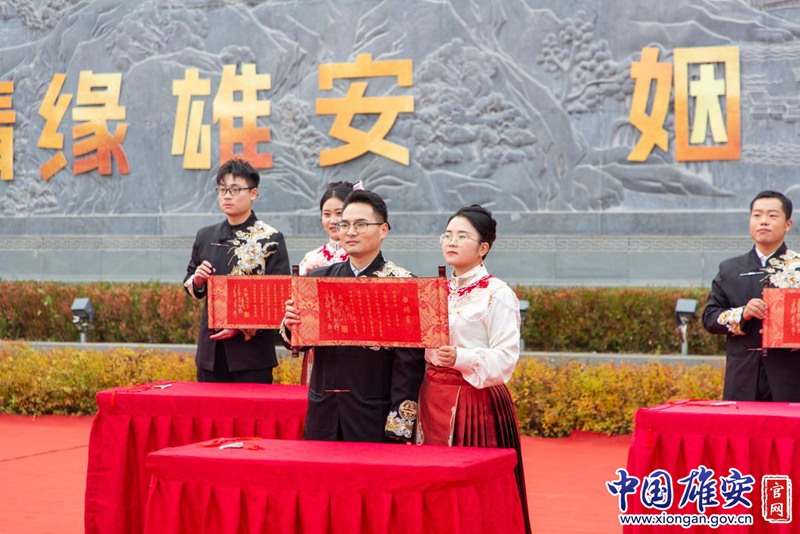 千里姻缘一线牵。活动现场,在新人分享爱情故事环节,“90后”疏解单位代表——新人孙绪脉、封婷称:“从校服到婚纱、从北京到雄安,我们的爱情故事因安家雄安、建设新区而圆满。今天这场具有仪式感的婚礼,见证了我们年轻人爱情和婚姻观念的转变,也见证着未来之城中爱的承诺。其实不必去远方,雄安是个好地方。”中式语言的浪漫,在新区建设者代表——新人李林根、王姝的分享中具象化,“者君贤达,今日良辰,余心怀虔敬,吾辞谦逊以贺吾与妻之伉俪之喜,吾妻介休人氏姓王名姝,姿客瑞庄。余自初见,便有冬日暖阳之意。遥思去岁大雪节前,月去牵红浅新区觅良缘,故乡隔十里,还在咫天间。”这段爱意表达,将现场甜蜜氛围拉满。