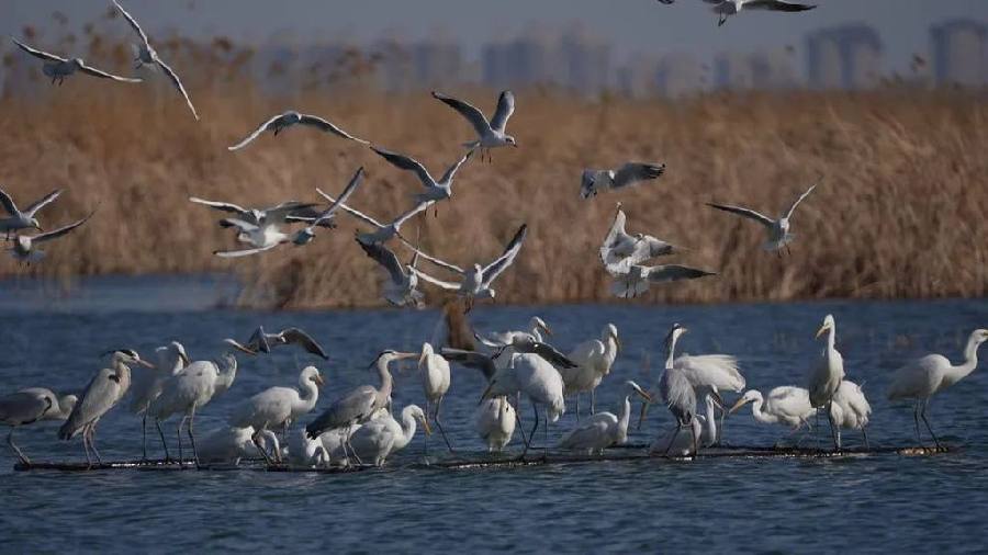 在南大港湿地,国家二级重点保护鸟类白额雁等候鸟在湿地上空翩翩起舞,普通鸬鹚、翘鼻麻鸭、凤头潜鸭、豆雁、绿翅鸭、赤膀鸭等候鸟也纷纷现身湿地,为这片“鸟类天堂”增添了几分生机。