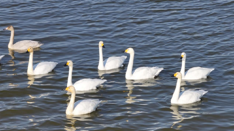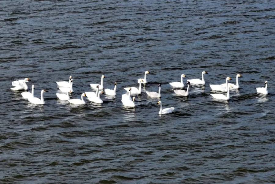 在唐山市曹妃甸湿地,天鹅在水上闲适游弋。吕瑞欣 摄