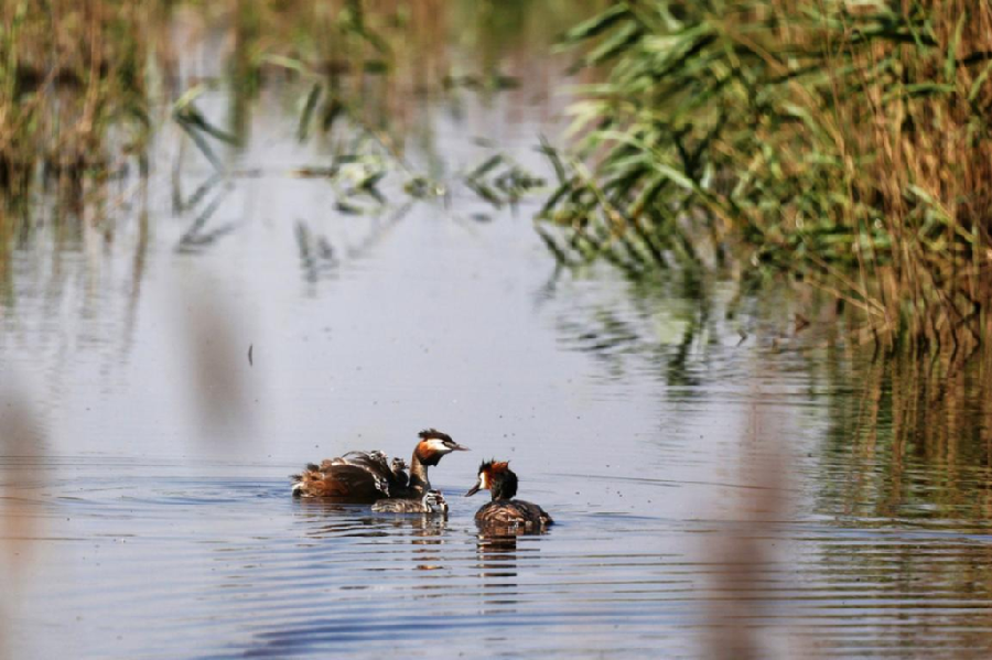 在水里嬉戏的凤头鸊鷉一家。刘全胜 摄