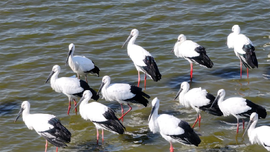 在唐山市曹妃甸湿地,东方白鹳、天鹅、白鹤等候鸟云集湿地。吕瑞欣 摄