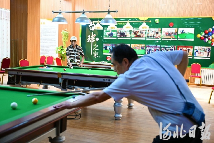 7月23日,三河市燕达金色年华健康养护中心活动室,老人在打台球。河北日报记者赵永辉 摄