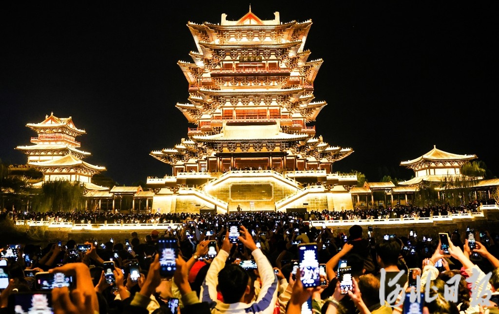 今年,大名县做美景区、做火业态,国庆期间接待游客215.9万人次,同比增长462.2%。图为10月4日晚,游客用手机拍摄大名石刻博物馆弘敬阁亮灯。河北日报记者李佳泽 摄