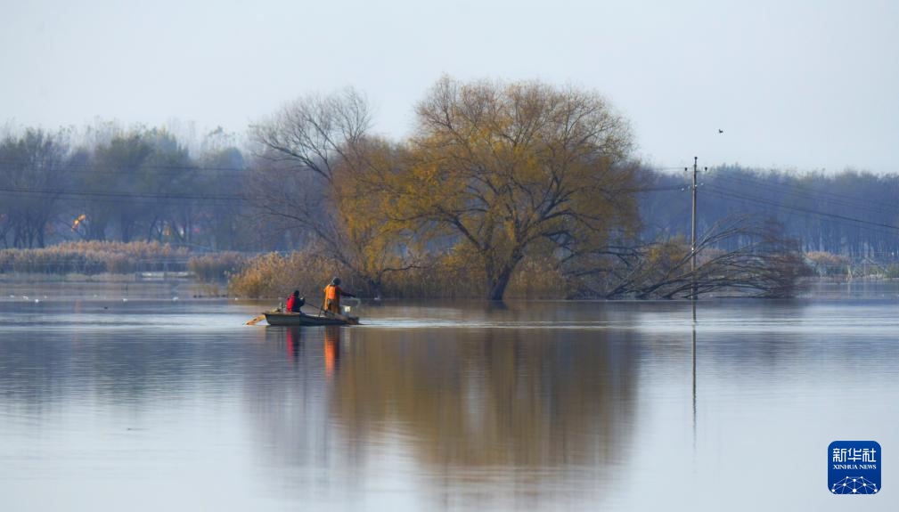 初冬时节,淀边村民行舟于白洋淀。新华社发(周龙山 摄)