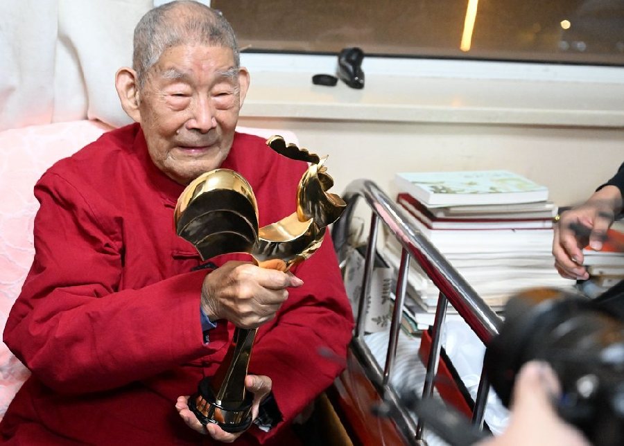 徐老从刚刚替他领奖归来的儿子徐丹手里接过奖杯,使劲地举起来,轻摇了两下,开心得像个孩子。“太沉了,我都快要拿不动了。”在场的人都笑起来,都明白他说的这个“沉”可不只是这个奖杯的实际重量,更是人民给徐老的沉甸甸的肯定和信任。