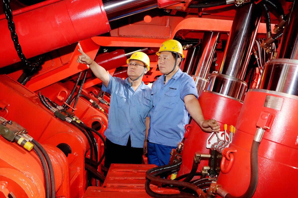 6月10日,冀中能源峰峰集团天择公司技术人员正在对制作的大阻力液压支架进行性能试验。(资料片)申春雨 摄