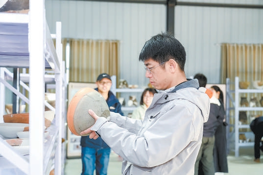 专家参观雄安新区文物保护与考古工作站陈列室内的标本。