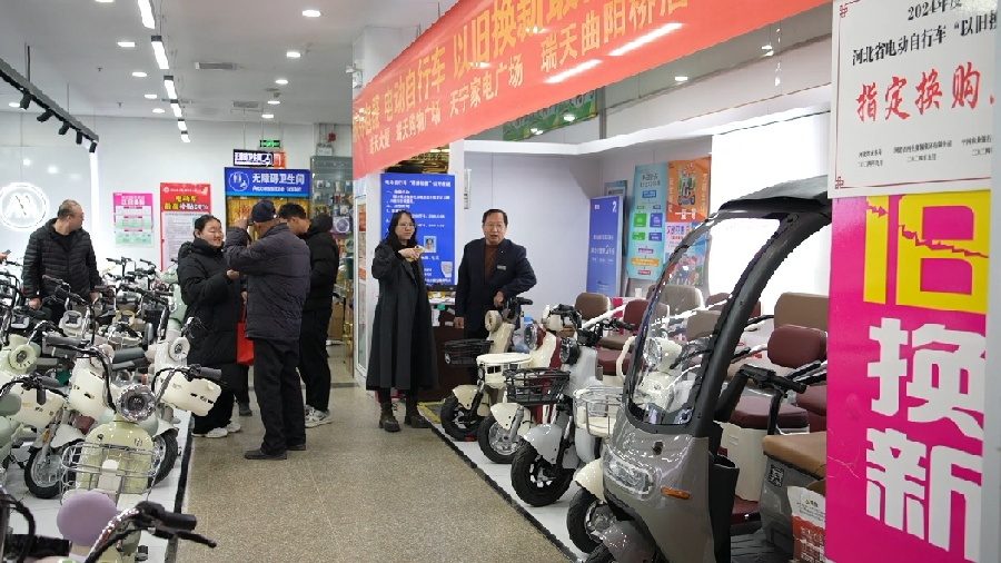 在石家庄正定县的一家电动自行车销售网点,前来选购电动自行车的消费者络绎不绝。市民樊李瑶家里的白牌电动摩托车受管控影响,再过几个月就将禁止上路行驶,他便专程赶在以旧换新的窗口期,准备换一辆符合新国标的电动自行车。