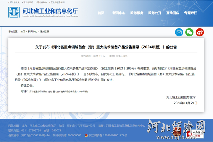 《河北省重点领域首台(套)重大技术装备产品公告目录(2024年版)》公告。网络截图