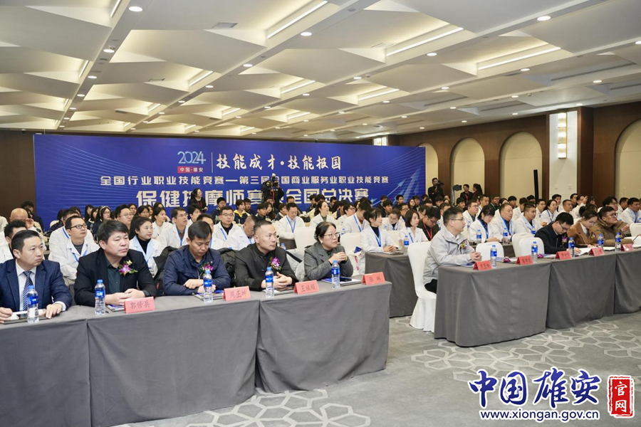 中国商业技师协会、河北雄安新区管理委员会公共服务局、容城县公共服务局、容东管委会、中国中医科学院望京医院特色诊疗中心、北京市成人按摩职业技能培训学校等相关单位领导嘉宾及大赛裁判员、教练员、参赛选手等参加大赛开幕式。