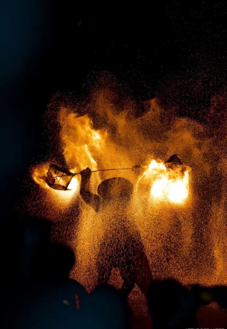 火壶表演是一种以操纵火焰的技巧与艺术相结合的表演形式,通过将烧好的木炭放入两边的铁网抖动产生火花,形成震撼的“火树银花”场面,寓意驱疾避祸和百家安宁。跟着非遗传承人的火壶表演,感受中华传统文化的独特魅力吧