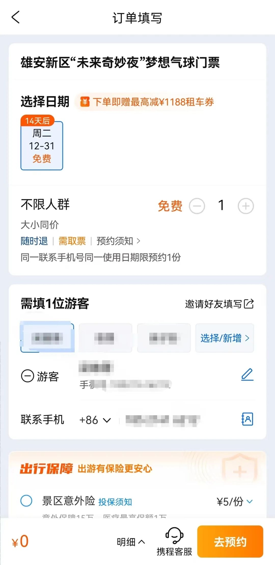Step2:点击免费预约,进入订单页面,填写订单信息;