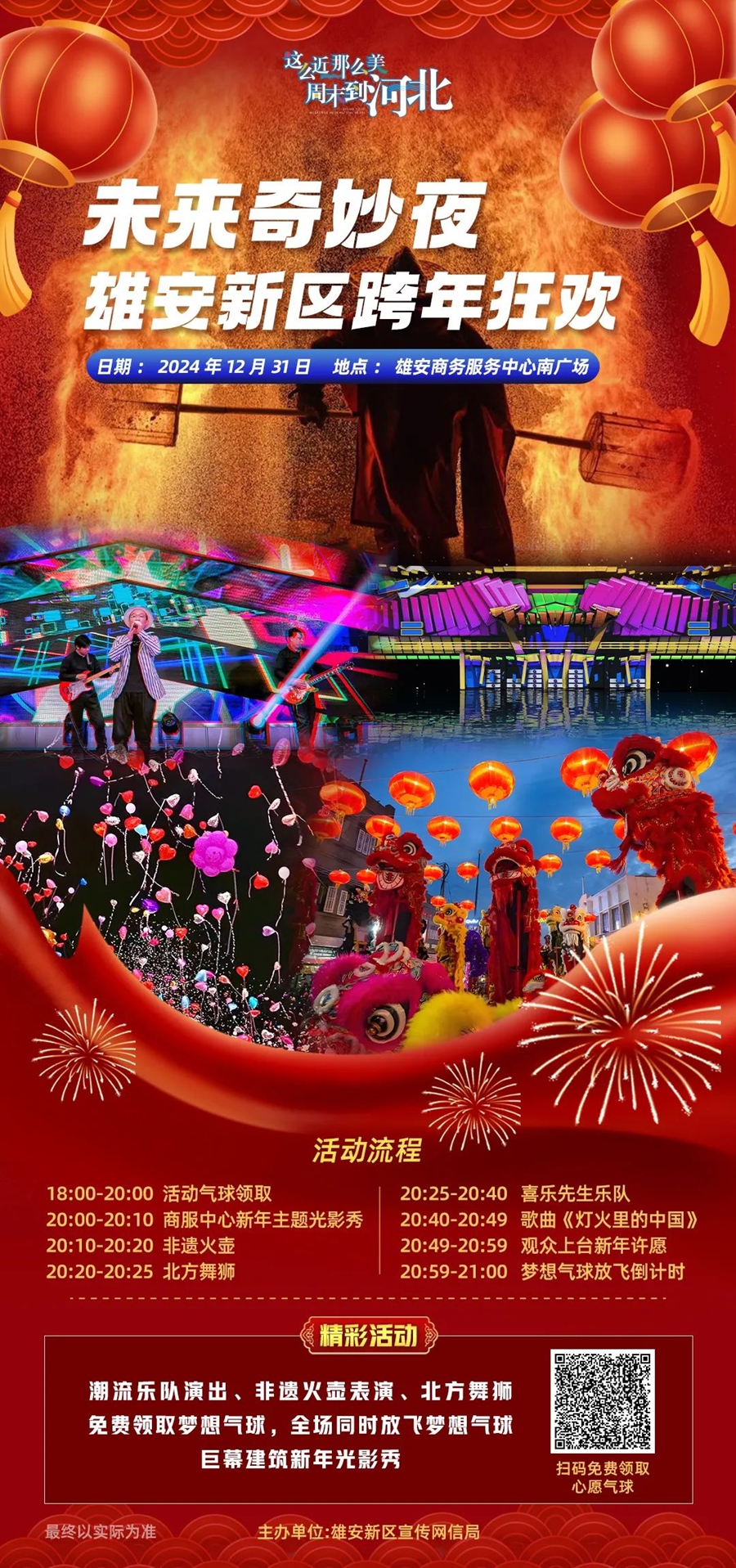 12月31日当晚,这里将打造全方位、多视角、立体感的跨年盛宴!2025年的新年钟声即将敲响,非遗节目展演、千人气球放飞、特色光影秀等活动火热来袭,快来与雄安新区一起奔赴美好未来吧!