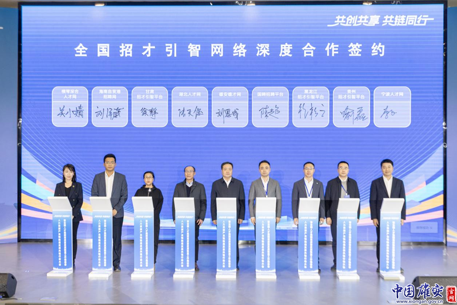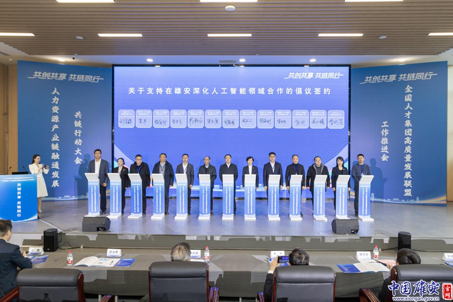 会上,专家代表分别上台作主旨演讲,围绕“全国人才集团高质量发展”主题积极建言献策。雄安雄才网、宁波人才网等多家招聘网络平台进行了全国招才引智网络深度合作签约,雄安人才发展集团与联盟成员单位进行了关于支持在雄安深化人工智能领域合作的倡议签约。最后,还举办了联盟轮值秘书单位交接仪式和“共链行动”启动仪式。