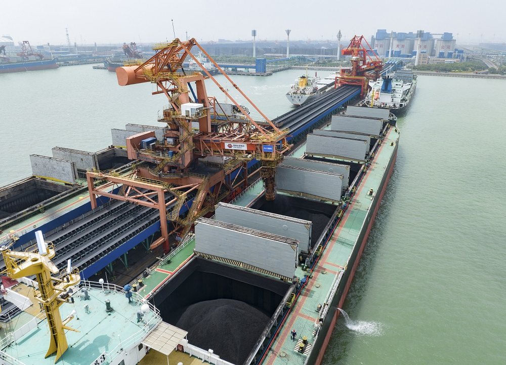 国家能源集团黄骅港务公司三四期码头装船机将煤炭装入船舱(无人机照片)。(资料片)新华社发